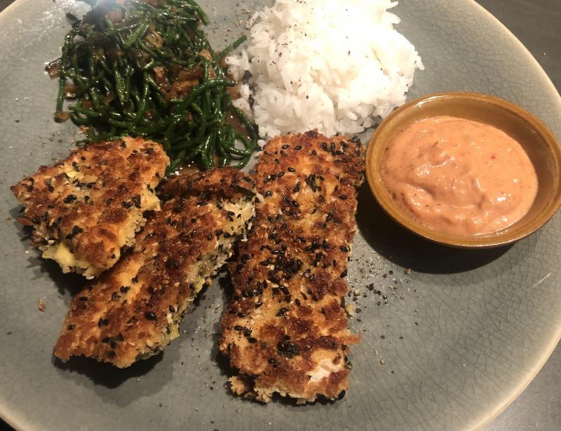 Bei uns gab es Saibling in Panko Sesam Kafir Limetten Panade, die noch von den Spitz Paprikas übrig geblieben ist. Dazu Reis, Queller und Marie Rose Sauce. (auch noch ein Rest)