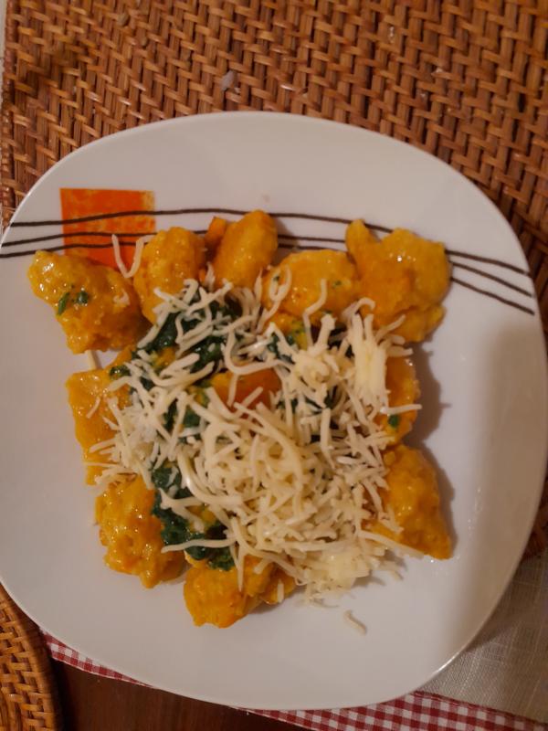Hier gab es Kürbisnockerln mit Petersilienpesto und geriebenem Emmentaler .