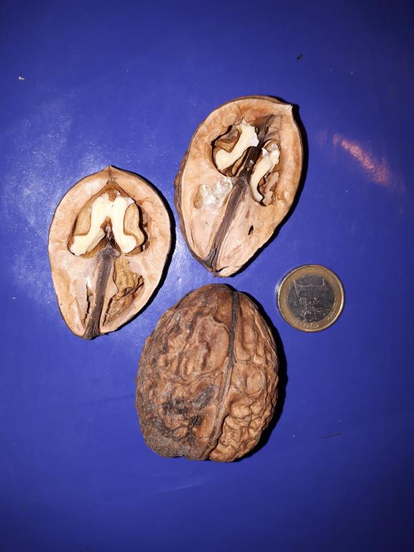 An dem Schimmelthema bei Walnüssen laboriere ich auch schon Jahre rum, genauergesagt an der ebenfalls unausgesprochenen Frage: Wie bleiben die Nüsse schimmelfrei? Und da bin ich, um es kurz zu machen nach vielen Bäumen, vielen Versuchen bei dem Punkt angelangt: Es ist zu 90% ein Sortenproblem, ein Problem des Baums. Noch genauer: Bäume mit so einem Problem sind immer Bäume keiner Sorte, also welche die aus wild aufgegangenen Nüssen entstanden sind. Die schnellste Ernte und eifrigste Nachverarbeitung, auch mit Profitrockner & Co helfen dann nicht wirklich. Knackt man ganz frisch geschüttelte Nüsse, um die Kerne einzufrieren und sieht man sich die Kerne in deutlicher Vergrösserung genau an, sieht man auch: Es fängt immer schon am Baum an, schwach sichtbar, aber eben schon im Gange.
