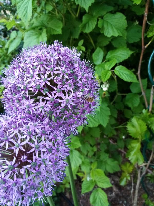 Hier ein zweiblütiges Allium vor Himbeere und Weinrebe.
