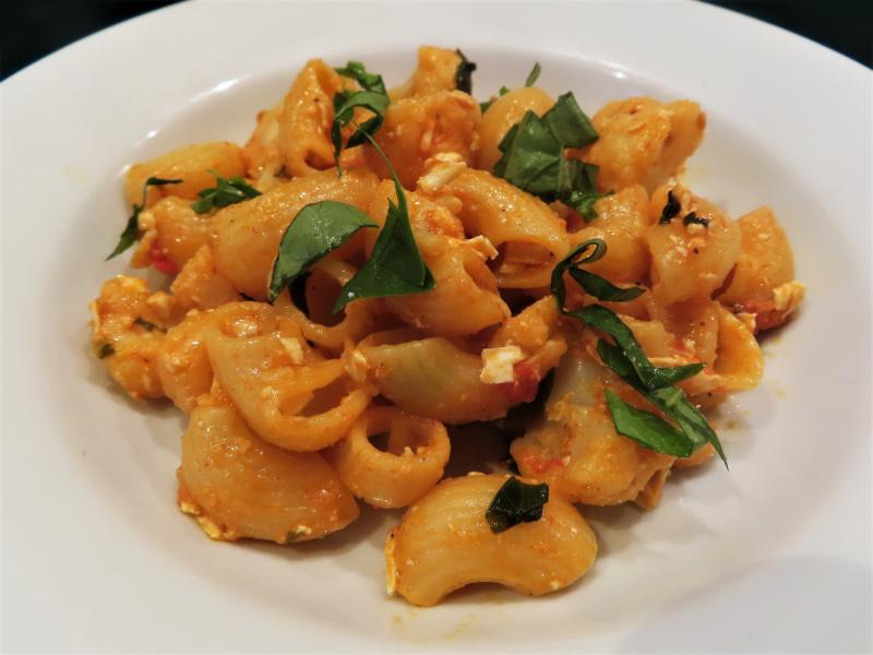 Hier gab es Chiocciole mit Karfiol/Blumenkohl, ein paar angebratenen und kurz gedünsteten Rispentomaten, Basilikum, am Ende frischer Butter, Parmesan und Ricotta salata. Der war noch von der Pasta alla Norma übrig und paßte gut dazu.
