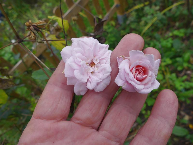 In allem, sehr klein.Feines ,schmales Laub und sehr kleine Blüten.Eine Knopflochrose,wie sie früher hier genannt wurde.Die Blüten duften kaum,und die Rose blümelt sparsam in Büscheln durchs Jahr.