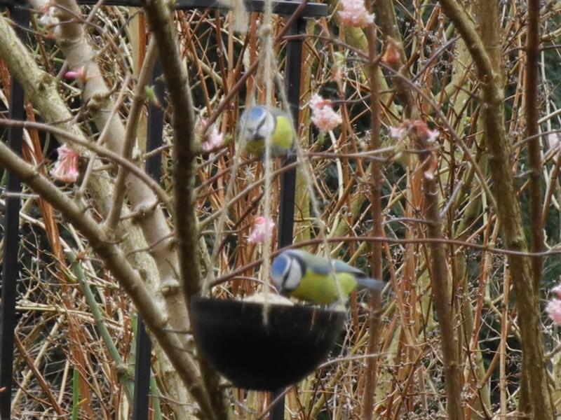 Vorhin konnte ich mal welche einigermaßen erkennbar aufs Bild bannen. Eine Blau- und zwei Schwanzmeisen?
