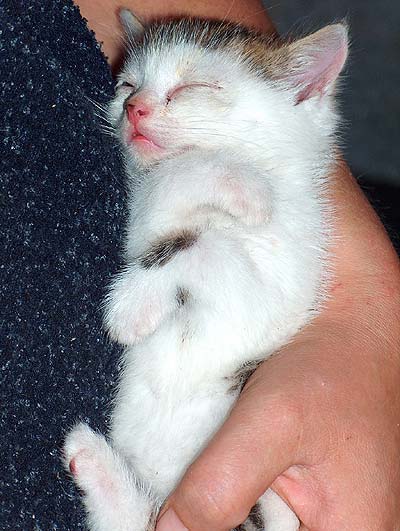 Jetzt verstehe ich ... auf dem ersten Bild sieht der Kleine noch sehr krank aus, finde ich. Auf dem zweiten, selig schlafend an Mamas Brust, ist er einfach nur ein süßer kleiner Kater.
