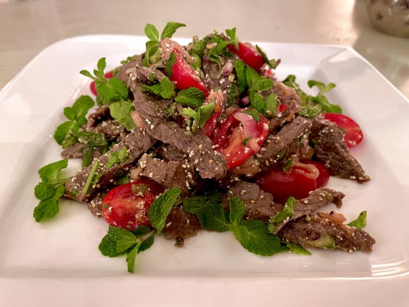 hier fand sich noch ein rest minze und koriander im biofreshfach und musswegrindfleisch zufällig auch. was also lag näher als nam tok?! diesmal mit tomätli statt jurke.