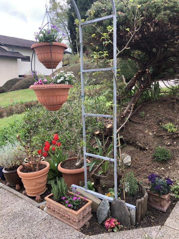 Ich möchte natürlich den Rosenbogen beranken, am liebsten mit einer Ramblerrose, die sich gerne auch über die Konifere ausbreiten darf. Die Töpfe müssen nicht unbedingt wieder dahin…..🤔