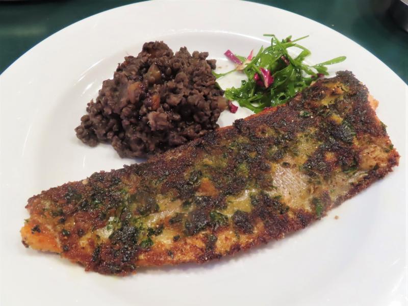 Ach so, heute gab es Lachsforellenfilet (neuerdings gibt es hier sehr gute ganz frisch) mit Belugalinsen. Danke für den Tip, Nina, sie waren wirklich noch besser als die grünen Berglinsen. Mit umgedrehtem Fisch ergab sich eine edle Farbkomposition 8) Dazu Rucolaradicciosalat, etwas mehr als die Garnitur auf dem Teller.