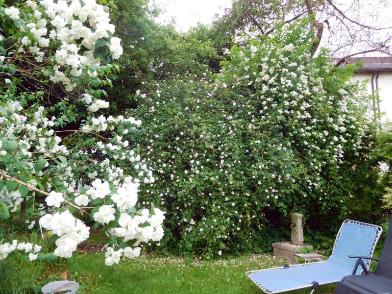 Rose vor Philadelphus-Hecke. Diese Sträucher lieben die Vögel auch sehr.