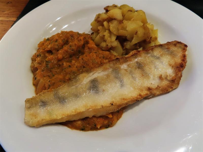Nachdem ich nochmal ein Stück weichfleischigen Kürbis geschenkt bekommen habe, gab es steirisches Kürbiskraut mit Zander und Erdäpflschmarrn.