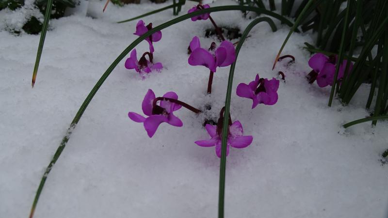 Sehr schön. Da bei uns etwas Schnee liegt kann man die hederifolium Jungpflanzen leider nicht sehen aber einige coums strecken ganz neugierig ihre Köpfchen heraus.