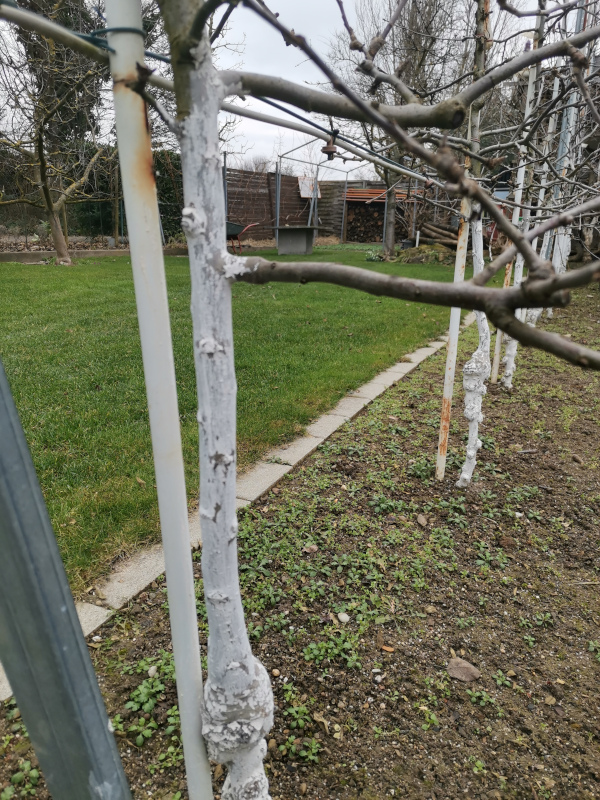 Anfang Januar war es warm, da habe ich die Stämme mit dem teuren Lac Balsam weiss gestrichen. Letzte Woche dann heftiger Regen mit Wind, insgesamt an die 50mm. Man hat leider gesehen, dass auch die guten Mittel ihre Grenzen haben: