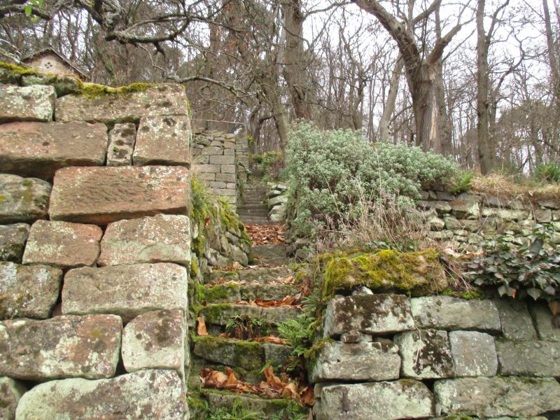 Dies ist von den beiden Treppenaufgängen der schmalere, hier mit Cistus 'Greywood Pink' über die Mauer hängend.