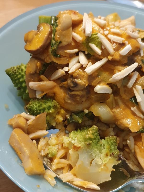 Bei uns gabs heute Hühnchen in Tomatenrahm mit Zwiebeln, Champignons und Pak Choi, Basmatireis mit gerösteten Mandelstiften und gebackenem Romanesco und Süßkartoffeln.