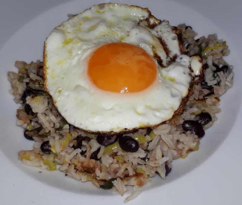 Gebratener Reis mit Porree und schwarzen Bohnen, Spiegelei und Endiviensalat