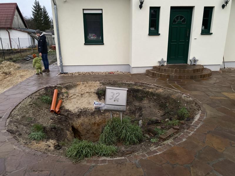 Die zu bepflanzende Stelle ist ein ca. 8qm großes rundes Beet in unserem Vorgarten, welches von einem Weg eingefasst ist. Oder besser gesagt es will ein Beet werden. Aktuell ist es noch ein 2m tiefes Loch in das unser Regenwasser fließt. Das wollen wir demnächst ändern und es mit flies auslegen, Kies einfüllen und dann mit Erde auffüllen.