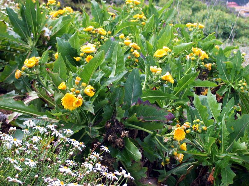 Das ist kein Löwenzahn sondern eine der zahlreichen endemischen Sonchus-Arten der Kanarischen Inseln. In den unergründlichen Tiefen meiner Festplatten sind da sicher Bilder zum Anlegen vorhanden, die finden sich aber nicht so schnell. Das weiße unten links ist Argyranthemum frutescens, das inzwischen in verschiedenen Farben jedes Frühjahr in Baumärkten und Gartencentern im Massen verkauft wird.