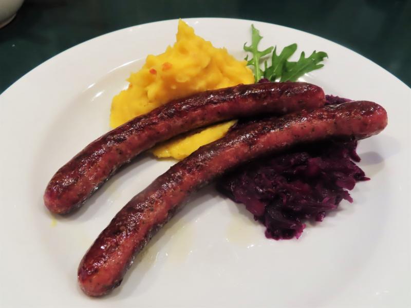 Bratwurst, Salzkartoffeln und. köstlicher Rotkohl mit Kumquats.