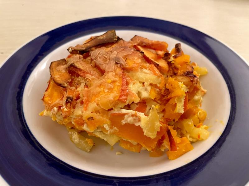 ton-in-ton gibt es hier derweil eine an uova zuccate inspirierte ofenfantasie: ohne geriebene mandeln, dafür mit fein geschnittenen kartoffeln und karotten, statt butter jede menge sahne. ansonsten gartenhokkaido, eier, geriebener parmigiano reggiano (und noch anderer käse), weißer pfeffer und salz – und ein hauch muskat.