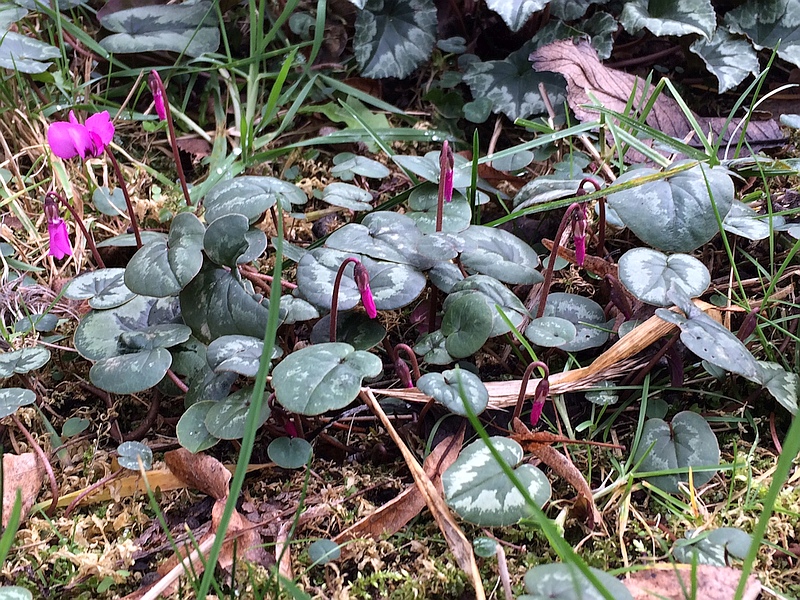 In meinem Bestand von C. cilicium tauchen Blüten auf, darüber schrieb ich ja schon mal. Jetzt sind die Blüten erkennbar und ich würde sie C. elegans zuordnen. Es scheinen mehrere Pflanzen zu sein. Welche Blätter zu den Blüten gehören kann ich nicht erkennen. Vielleicht zeigt sich das, wenn die C. cilicium evtl. eher einziehen. Ich habe an anderer Stell ein C. elegans, welches neu ist und weit entfernt von dem anderen Bestand steht, den ich vorwiegend aus Samen zog (weiß jetzt gar nicht mehr woher die stammten.) Das neu gesetzte C. elegans hat bisher nur eine Blüte geöffnet, die auch noch angeknabbert ist, also nicht vorzeigbar.