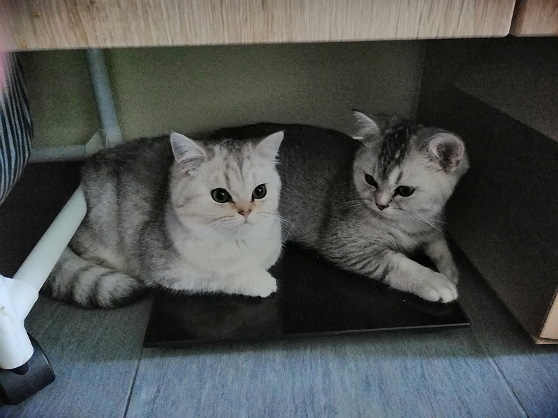 Es ist eine Sache, was wir planen und eine andere, was das Katzenvolk ausheckt. Eines Tages hatte sich ein Minikatz zwischen den Kartons durchgeschoben und auf den Weg nach unten gemacht. Ich saß im Wohnzimmer im Homeoffice und sah nur eine Bewegung aus den Augenwinkeln. Also nix wie hinterher, flink die Ausbrecherkönigin geschnappt und wieder nach oben gebracht. Isaak hatte nichts bemerkt ;D. Ein paar Tage später saß plötzlich Yvo vorm Bad und schaute neugierig. Er verhielt sich ruhig, uff! Es wurde auch immer schwieriger, sie zu trennen, denn die Minimäuse waren neugierig und Yvo ebenso. Zu Beginn saß Fiona vor der Sperre, die wir etwas hochgeschoben hatten, damit sie durchschauen konnte und war gefühlsmäßig hin- und hergerissen. Das ging dann immer so: quiek, fauch, quiek, fauch ;D. Nach etwa zwei Wochen wurde sie immer selbstsicherer.