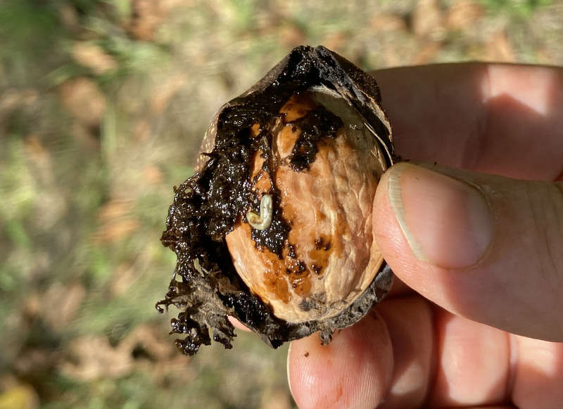 ja das macht keine Freude mehr. Unter den Bäumen nur schwarzer Matsch. Und der Pilz dringt durch die Naht in die Nuss . . . .