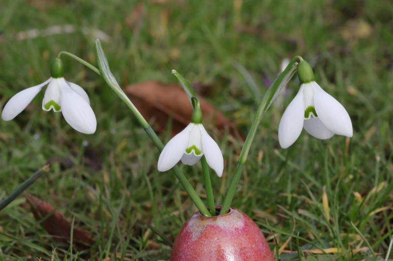 ´Berliner Kaiser´habe ich als G.n. imperati, d.h. eine aus Italien stammende nivalis-Form erhalten. Zum Vergleich habe ich meine drei G. imperati einmal zusammen in die Vase gesteckt: links ´Berliner Kaiser´, Mitte ein namenloses von Philip Ballard, rechts ´Ginn´s Imperati´.