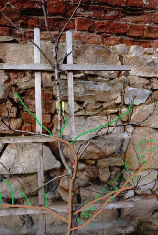 Deine rot gekennzeichneten Schnittvorschläge sind auch anders; aber mit ihnen wird sich wohl wegen der Spitzenförderung kaum ein Spalier erreichen lassen. Daher "Birnen wird´s trotzdem geben..."
