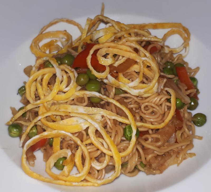 Mie-Nudeln mit Chinakohl, Paprika und Erbsen, Eistreifen, Endiviensalat