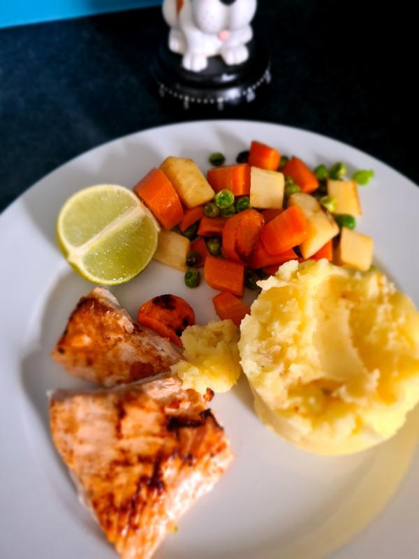 Gestern gab es mit Honig glasierten Lachs, Kartoffelpü mit Wasabi verfeinert dazu in Butter gedünstetes Wurzelgemüse