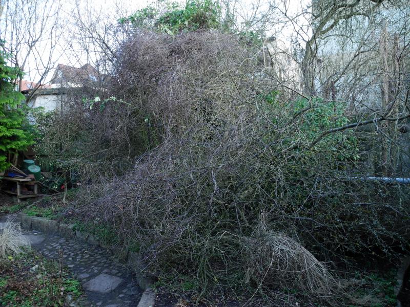 Hoffentlich kracht nicht wieder ein Baum vom höher gelegenen Nachbargrundstück zu uns runter. Wir sind gerade mit Sägen und Häckseln fertig geworden.Der dicke Stamm des uralten Malus ist nicht unter dem Clematisgestrüpp zu sehen.