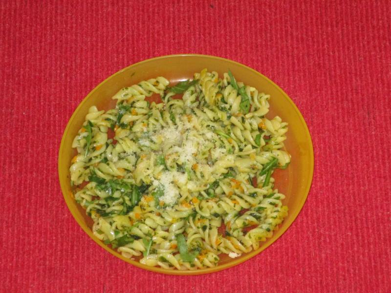 Hier gab es Nudeln in Ruccola. Extra klein gehackt für die Takis :) - kleine Kinder mögen meist keine Blätter, wie Salat, zu essen. Wer mochte, bekam ein paar grob zerkleinerte Ruccolablätter zusätzlich oben drauf.