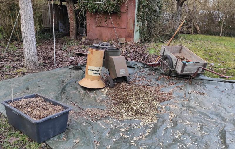 Im Gemüsegarten das Beet für die Wurzelgemüse mit Kompost versorgt und mit Folie abgedeckt. Wegen der Hühner, die laufen noch ein paar Wochen frei rum. Kompost umgetzt, damit ich Platz für den Staudenschnitt habe. Das wenige an dickeren Stücken und Ästchen das angefallen ist, wird noch geschreddert.