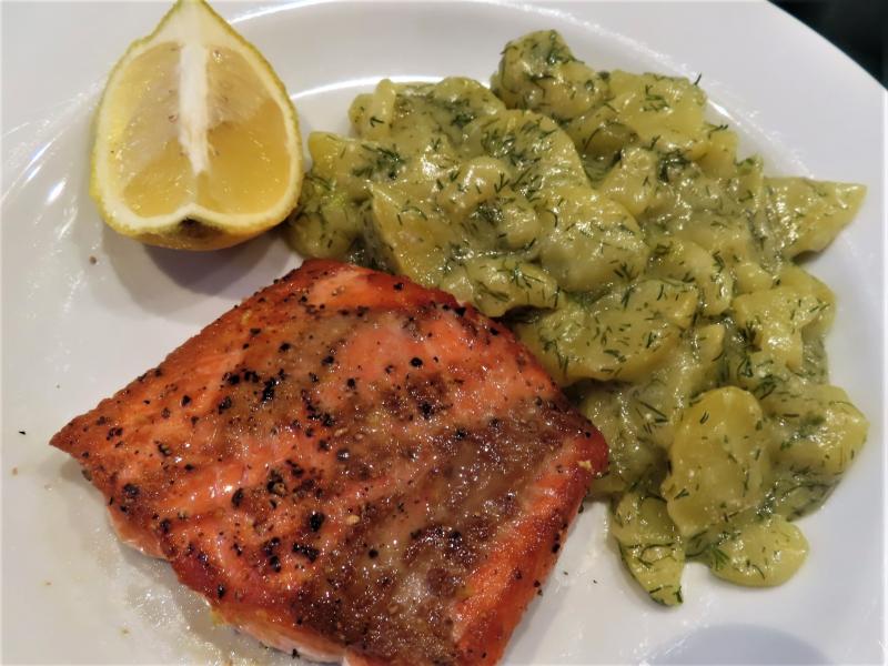 Hier war erstmals frischer Wildlachs im Angebot, das mußte genützt werden. Fast hätte ich ihn zu lange gebraten, das Fleisch ist dünkler und daher viel weniger fett, entsprechend dezent die Geruchsentwicklung beim Braten. Im Kühlschrank war noch ein Riesenbuschen Dille vom Markt, also gab es dazu Dillerdäpfl. Sehr gut ;)