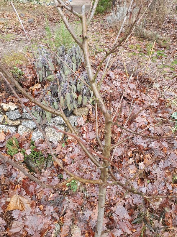 Die Blütenknospen am Stamm würde ich ausbrechen (auch wenn es schwer fällt), um dieses Jahr nochmal alle Energie ins Wachstum zu stecken.