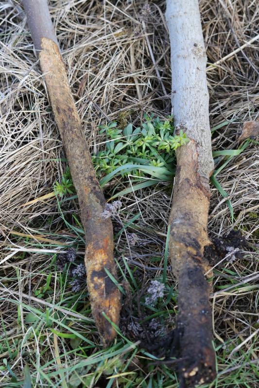 Und noch ein Bild. Hardy Hartford und eine Feige aus dem höchsten Weinberg der Schwäbischen Alb. Sogar das Holz ist durchgefressen, Wurzeln sind noch dran, keine weiteren Hinweise (passende Löcher oder Erdhäufen) auf Wühlmäuse. Fraß hat am Stamm begonnen, Totalschaden (ich bin sehr häufig auf dem Grundstück) innerhalb weniger Tage.