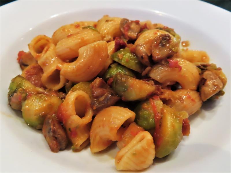 Hier gab es Chiocciole mit Kohlsprossen die II., verbessert mit etwas mehr Tomate, geviertelten und kurz sautierten Champignons und einem Schuß Hühnersuppe, die grade nebenbei kochte, diesmal ohne Mandeln. War sehr gut.