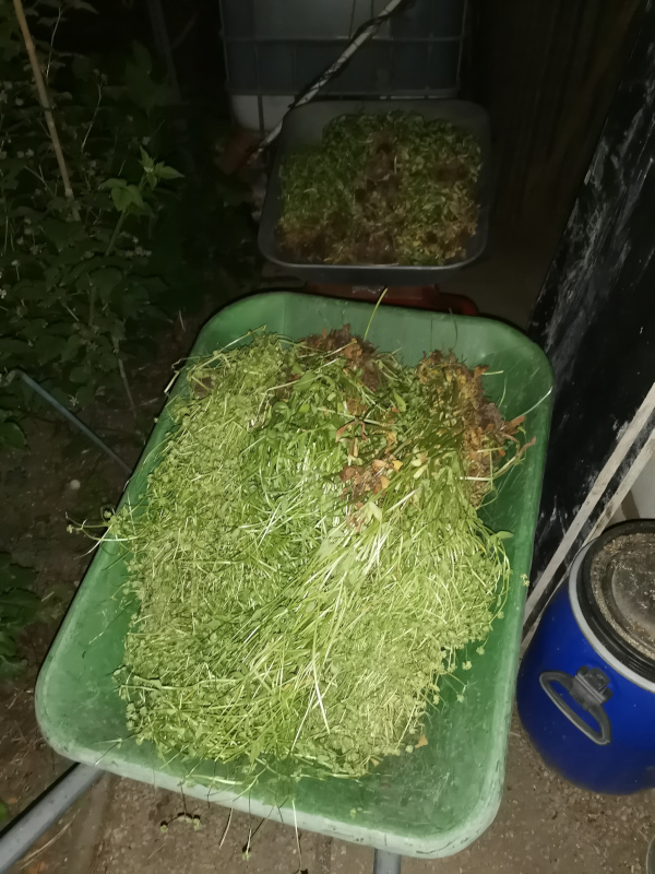 Deshalb den Bestand abgeerntet, also rausgezogen, notfalls mit Erdpresstopf, weil (spät) gepflanzter wurzelt nicht so intensiv wie direkt gesäter, das ganze vorsichtig in 4 Schubkarren verfrachtet und dort wirds jetzt einmal am Tag wie Heu gewendet, damit die Energie der Pflanzen in die Samenreife geht.