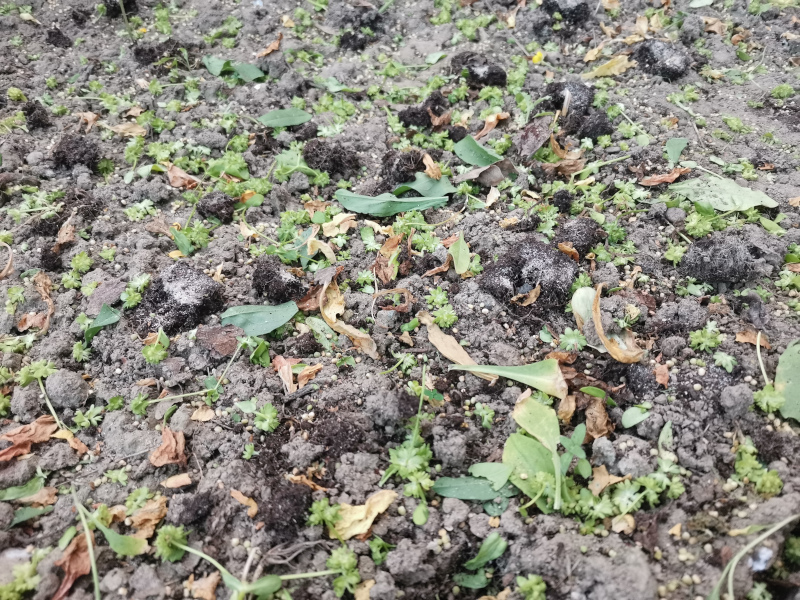 Dementsprechend verseucht ist jetzt allerdings auch die Fläche mit Ausfall-Feldsalat, also hier muss flach gewieselt werden und da als Folgekultur Winterporree geplant ist, können dort auch die Reihen im Winter sauber gehalten werden bis nächstes Jahr wieder eine Sommerung reinkommt.