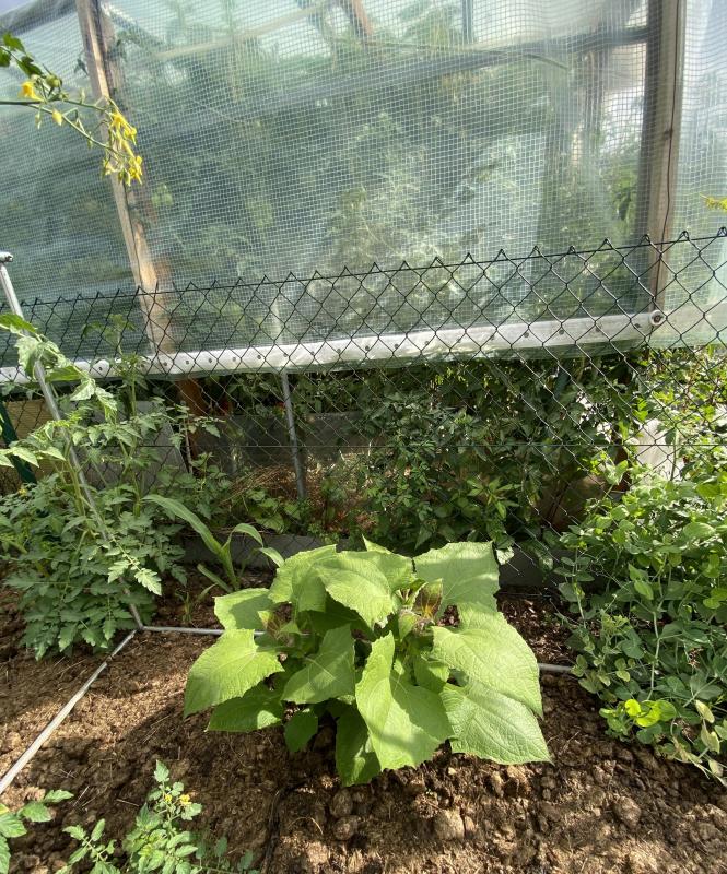 Jetzt ein neuer Platz: Hinter Nachbars Tomatenfolienhauskonstruktion, die sich auf der Südseite befindet. Die ärgert mich, aber mittlerweile kann ich den entstandenen Halbschatten auf meiner Seite besser nutzen - etwa für Yaconpflanzen. Ich habe nicht bewässert, obwohl es bis gestern wie mittlerweile üblich sehr trocken war. Aber eine Mulchauflage. Und sie wächst und wächst und wächst mehr als an allen früheren Pflanzplätzen. Ist jetzt Ende Juli so weit wie früher Ende September.