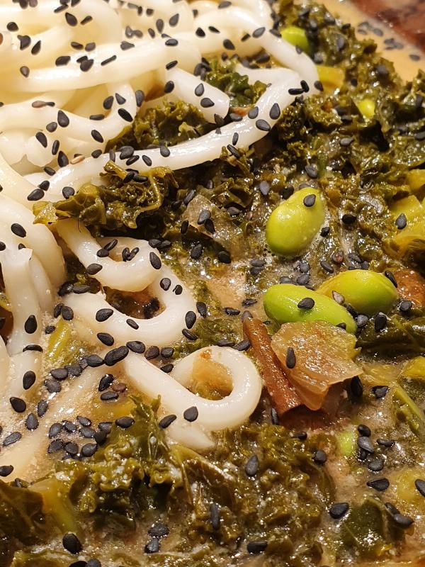 Rest Brühe vom Ramen gestern statt Hühnerbrühe. Edamame zusätzlich zum Grünkohl. Statt Walnusskerne habe ich geröstete Cashewkerne zu Muß gemacht und damit die Soße cremig gemacht. Obendrüber schwarzen Sesam. Es war wirklich sehr köstlich! Danke für die Inspiration, da wär ich nie drauf gekommen.