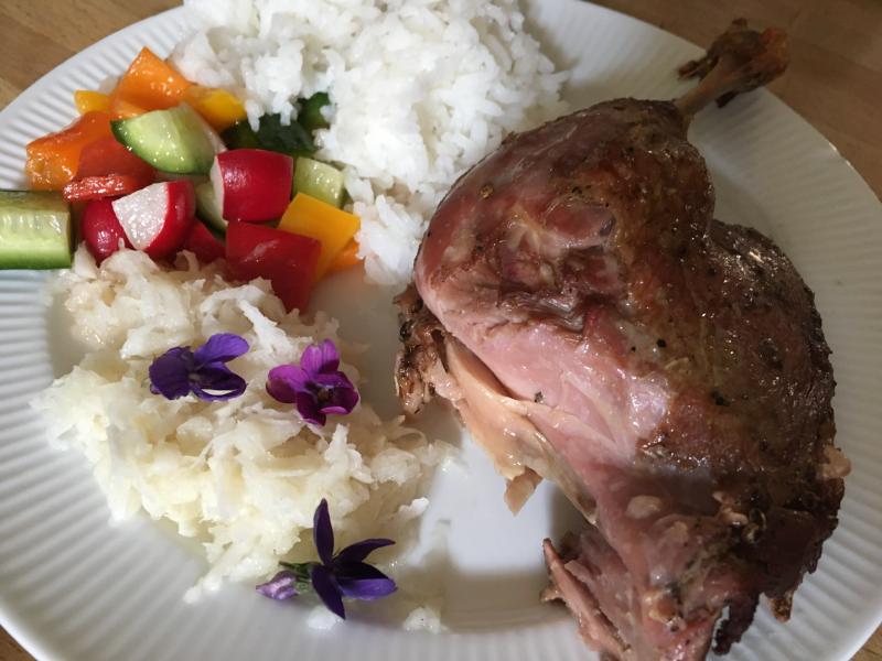 Hier gabs eine halbe Ente, mariniert und vorgegart gekauft, Reis und zwei Salate von meiner Tochter gemacht. Rettich und bunter Mix.