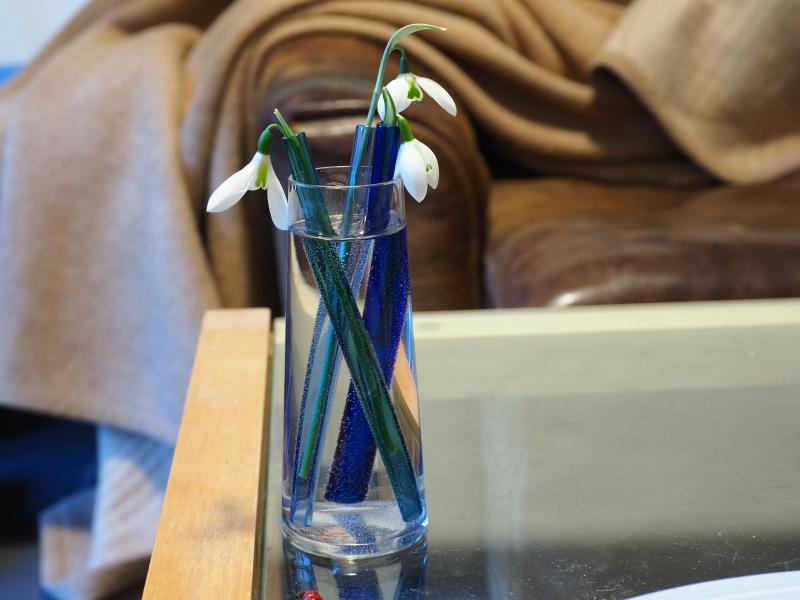 ein paar Schneeglöckchen in Glas. Vase WMF Wagenfeld. Trinkhalme ALDI.
