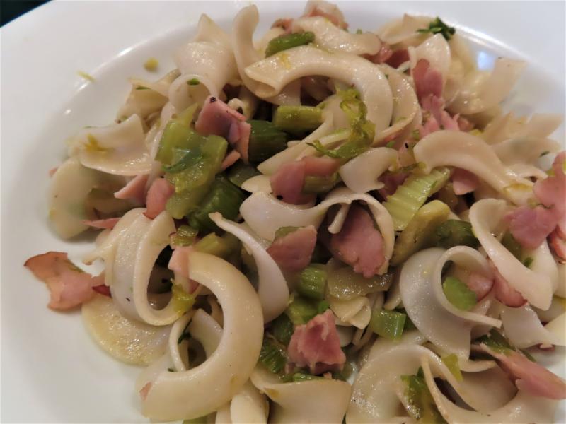 Wenn es um diese Zeit knackigfrische Stangensellerie gibt, mach ich gern damit erweiterte Schinkenfleckerl. Geht schnell und schmeckt so, daß ich dann immer beschließe, sie öfters zu machen :)