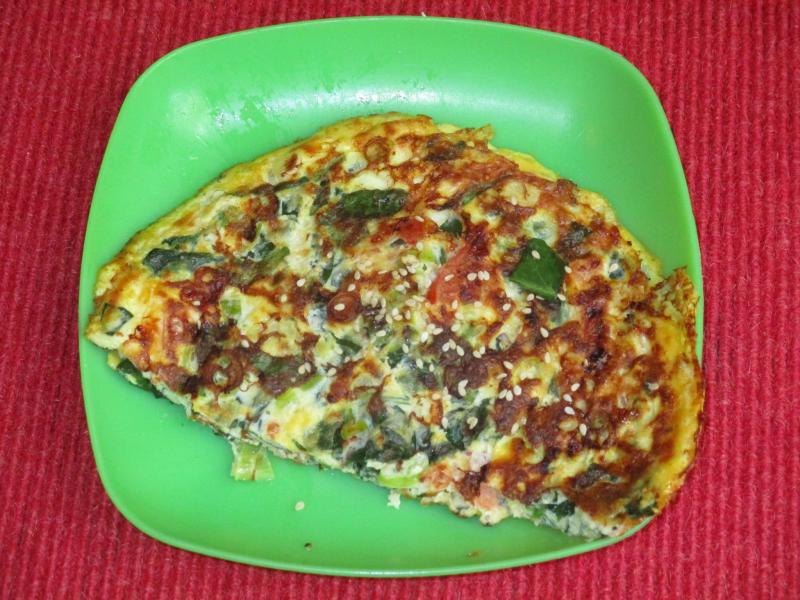 Hier Omelette mit frischem Spinat. Die Tomaten waren etwas ungünstig dabei. Aber trotzdem schmackhaft.