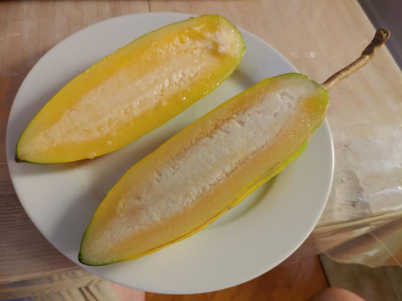 Der Geschmack süss-sauer mit angenehmer Säure und Süße, sehr fein aromatisch (erinnert mich an Frangipani-Duft). Würde sehr gerne mehr davon essen (normale Papaya aus dem Fruchthandel schmecken dagegen "stumpf", also ohne Säure; das Aroma ist auch anders).