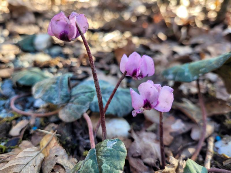 Nochmal meine neue, kleine Cyclamen Ecke. Das rechte Coum sieht deutlich größer aus, auch die Blüte ist doppelt so groß wie bei den anderen. ::)