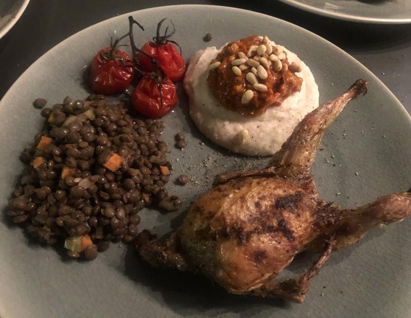 Bei und gab es gestern weiße Bohnen-Püree mit Muhammara (statt Walnüsse Pinienkerne), dazu grüne Linsen mit Zwiebeln, Knoblauch, Staudensellerie, Balsamico, im Ofen geschmorte Tomaten und Wachtel (Zitrone Rosmarin, 7 Gewürze Baharat). Es hat gemundet. :)