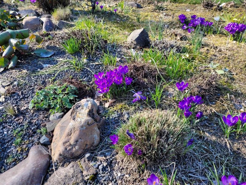 Hier Elfenkrokus Roseus mit Schneeglöckchen und nicht mehr sichtbarem schwarzen Schlangenbart - ich müsste hier wohl mal auslichten...