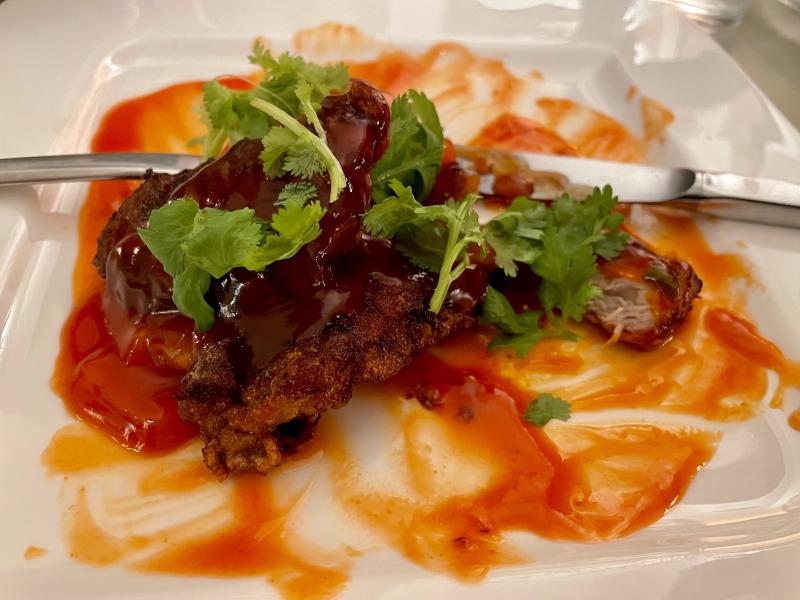 zur erläuterung des unpassenden europäischen bestecks: das schnitzelfleisch war zu dick für einen stäbcheneinsatz (vor)geschnitten, es schmeckte aber auch so. ;)