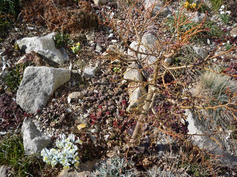 Ich vermute das die Aethionema oppositifolia jetzt schon blüht, weil sie in sonniger Lage unter Glas steht. Ich werde sie aber demnächst ins Alpinum pflanzen und im Winter vor Nässe schützen. Das sich wandelnte Klima erlaubt solche "Experimente" definitiv.